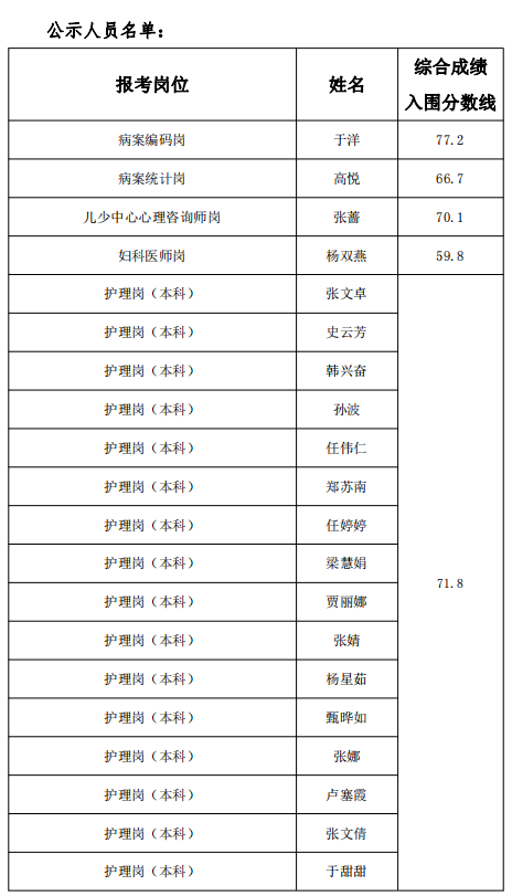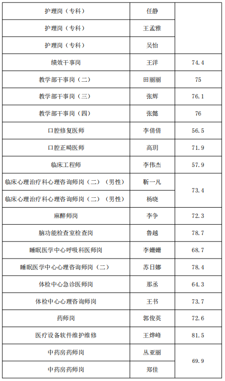 根據(jù)內(nèi)蒙古自治區(qū)第三醫(yī)院(精神衛(wèi)生中心)2021年度公開(kāi)招聘合同制工作人員公告,經(jīng)筆試、資格復(fù)審、面試等程序,現(xiàn)對(duì)進(jìn)入體檢和考察范圍人員予以公示,個(gè)人綜合成績(jī)登錄報(bào)名考試系統(tǒng)查詢(xún):