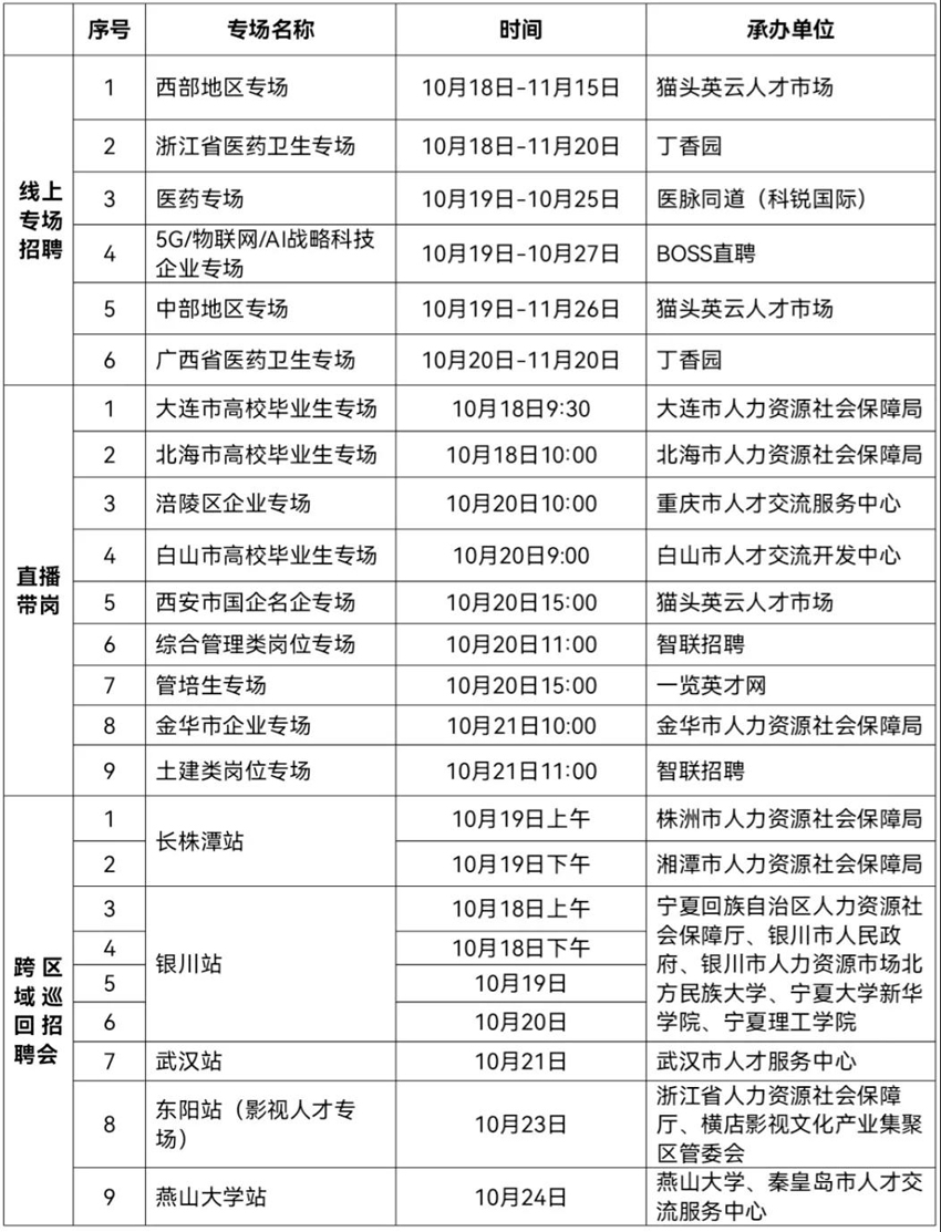 線上活動(dòng)15場(chǎng):包括醫(yī)藥、5G/物聯(lián)網(wǎng)/AI戰(zhàn)略科技企業(yè)、西部地區(qū)、浙江省醫(yī)藥、中部地區(qū)、廣東省醫(yī)藥等6場(chǎng)線上專場(chǎng)招聘會(huì)和9場(chǎng)直播帶崗。截至10月14日,已有2174家用人單位提供約4.7萬個(gè)崗位,后期將有更多用人單位陸續(xù)加入。